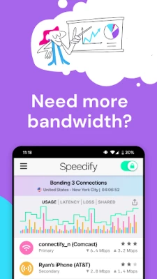 Speedify's unique channel bonding technology lets you combine all available connections together to improve performance and reliability.