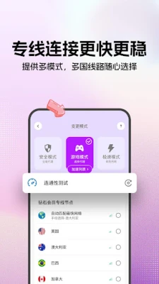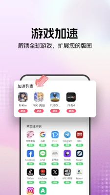 ✓ 游戏加速:支持游戏加速功能,通过连接专门优化的游戏服务器,减少数据传输路径,显著提升游戏速度和稳定性,减少游戏延迟、卡顿、断线等情况,让你畅玩全球顶级游戏;