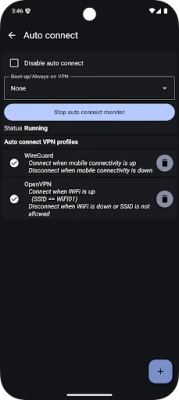 * Wear OS companion app to connect/disconnect VPN from your watch (require Android >= 8.0)